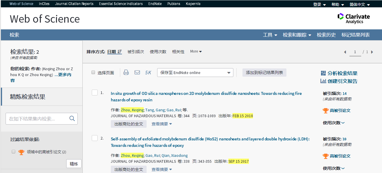 基本科学指标数据库(Essential Science Indicators,简称ESI)最新数据显示,安全工程系周克清老师发表的论文“In situ growth of 0D silica nanospheres on 2D molybdenum disulfide nanosheets: Towards reducing fire hazards of epoxy resin”入选高被引论文。该论文是周克清老师以太阳成tyc33455ccwww(武汉)太阳成tyc33455ccwww为第一单位、第一作者和通讯作者身份发表的第2篇ESI高被引论文。2018年7月周克清老师发表的论文“Self-assembly of exfoliated molybdenum disulfide (MoS2) nanosheets and layered double hydroxide (LDH): Towards reducing fire hazards of epoxy”曾同时入选ESI高被引论文和热点论文。