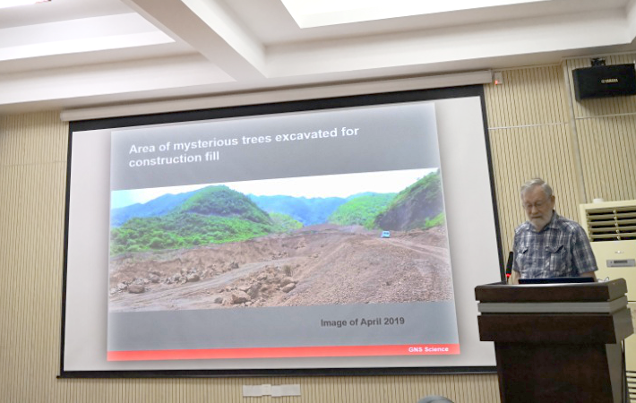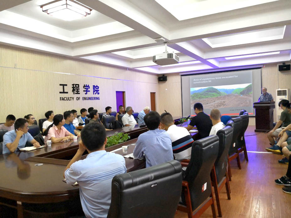 Mauri McSaveney教授以《The mysterious trees of Touzhai and other mysteries of large rock avalanches》为题,介绍了他在高速远程滑坡碎屑流领域最新的研究进展,特别是在1991年头寨沟、2008年大光包和2009年鸡尾山高速远程滑坡碎屑流中发生的奇怪地质现象,并采用现场调查、数值模拟与室内试验等多种手段,揭示了高位远程滑坡碎屑流的运移机理。汇报后,与现场师生进行了深入交流。