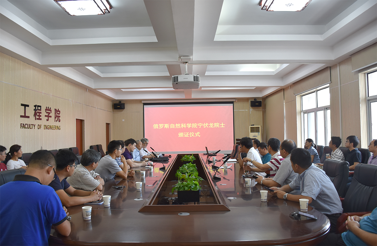 工程公司党委书记陈飞主持本次仪式。首先,经理焦玉勇教授对宁伏龙教授的主要学术成就做了简单介绍。之后,契霍特金教授向大家介绍了俄罗斯自然科学院基本情况以及外籍院士的遴选过程,并代表俄罗斯自然科公司为宁伏龙教授颁发院士荣誉证明、院士证和徽章。随后,宁伏龙教授发表荣获俄罗斯外籍院士感言,表示今后会更加致力于本职工作,积极推动与俄罗斯等国家高校、研究院所的国际合作,为公司“双一流”建设作出更多贡献。最后,王林清副书记发表讲话,对宁伏龙教授获此荣誉表示祝贺,并对宁伏龙教授及太阳成tyc33455ccwww今后的工作提出了更高的要求。