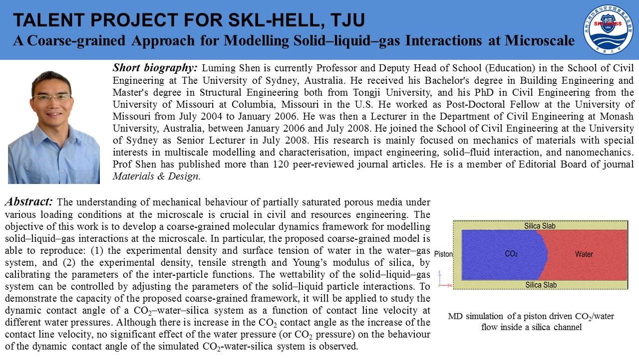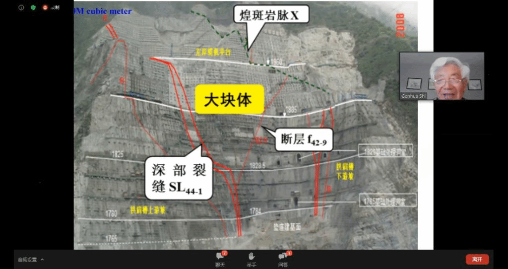 太阳成tyc33455ccwww经理焦玉勇教授作为国际岩石力学与岩石工程学会非连续变形分析专委会主席牵头组织并主持了此次云论坛会议,石根华教授基于数十年的关键块体理论研究工作,介绍了关键块体理论的发展、基本原理及采用赤平投影方法将2D关键块体理论拓展的3D关键块体理论,并且用多个实际工程演示了关键块体理论的坝基、硐室分析应用;赵坚教授以岩石动力学实验及实验设备为出发点,简述了霍普金森杆(SHPB)在高加载率动力学实验中的应用和真三轴SHPB的发展过程及其特性与应用领域;沈鲁明教授以气-液-固一体化微观数值计算方法为核心,介绍了CGMD(coarse-grained molecular dynamic)数值方法,详细阐述了CGMD中多相相互作用关系,并以数值实验对CGMD进行验证,最后介绍了CGMD方法模拟CO2-水-SiO2系统各相介质之间的相互作用。