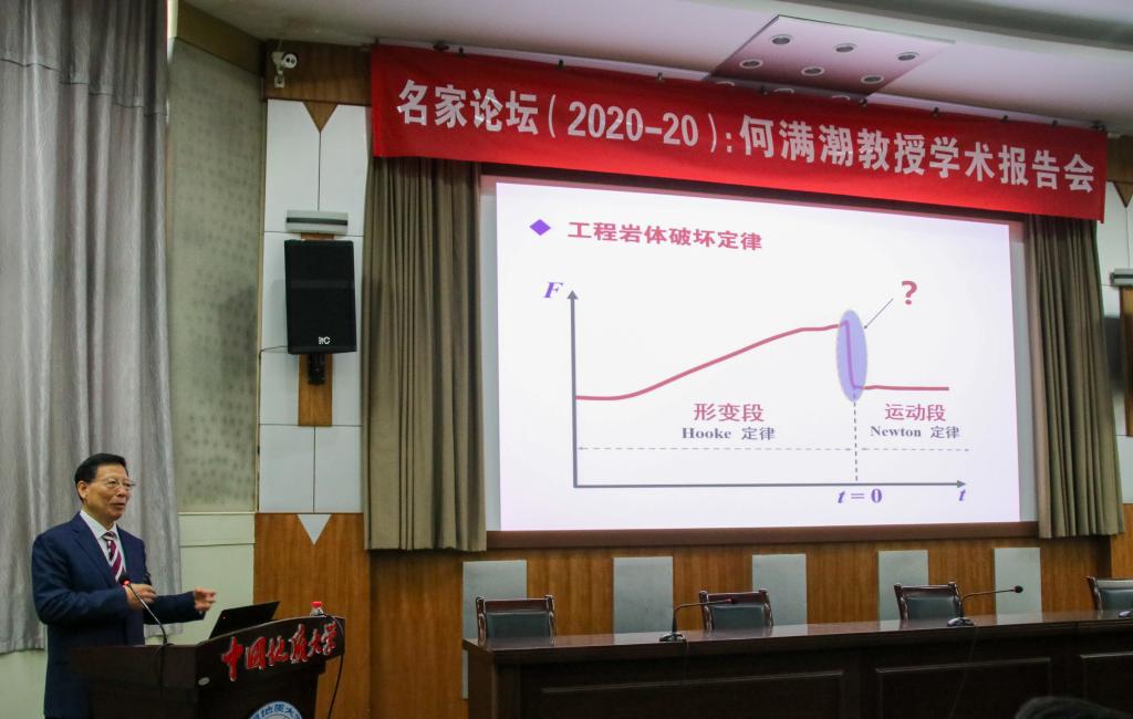 何满潮院士报告主要分成滑坡灾害现象、牛顿力变化定律、牛顿力监测系统、滑坡监测预报实例和未来展望五个部分。何院士由浅入深地介绍了滑坡灾害现象的力学原理,围绕在滑坡灾害预防研究中牛顿力的产生时间、牛顿力灾变特征及灾变时间和牛顿力的测量方法这三个问题,提出了牛顿力变化定律,带领团队研发出了由数据采集传感系统、数据发射系统、北斗基站、供电系统、NPR巨型锚索、数据接收系统以及数据处理分析中心等部分组成的牛顿力监测系统,并研发了力学传感器与卫星通讯装备和NPR杆件材料,攻克了测量牛顿力的关键技术难题。
