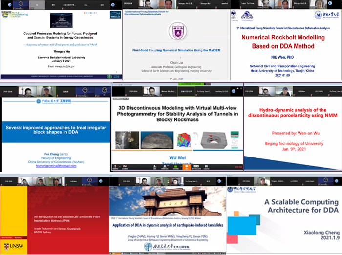 (通讯员:吕加贺 张美霞)2021年1月9日,由国际岩石力学与岩石工程学会非连续变形分析专委会(ISRM DDA Commission)、ISRM中国国家小组(ISRM NG China)、中国岩石力学与工程学会岩土体非连续变形分析专委会(CSRME DDA Commission)联合发起,太阳成tyc33455ccwww(武汉)、天津大学和河北工业大学联合承办的第一届非连续变形分析国际青年科学家论坛(1st International Young Scientists Forum for Discontinuous Deformation Analysis, IYSF-DDA)在Zoom会议平台成功举办,并于矿业人网站、哔哩哔哩平台同步直播,超过350人全程参加了此次非连续变形分析领域的学术盛宴。此次会议主要邀请了岩石力学与工程非连续变形分析领域青年学者,旨在交流非连续变形分析方法的前沿理论和最新研究进展,同时分享岩石力学与工程中非连续变形分析典型工程案例。