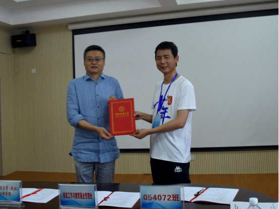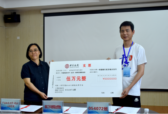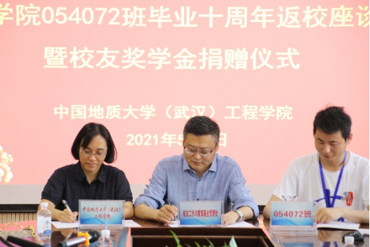 随后举行054072班员工奖学金捐赠仪式。员工大使袁攀同学简要介绍了发起奖学金的初衷、目的和用途。他说到,毕业十周年之际,为了表达对母校的感恩和思念,班级同学想为公司做些有意义的事情,经过商讨,决定捐赠奖学金用来对立志投身工程勘察行业的学弟学妹们的激励与帮助。
