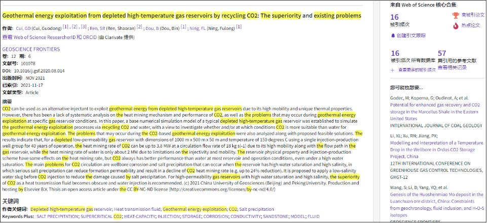 (通讯员:黄静)根据2022年3月基本科学指标数据库(Essential Science Indicators,简称ESI)最新数据显示,公司崔国栋副教授于2021年在国际地学期刊Geoscience Frontiers上发表的学术论文“Geothermal energy exploitation from depleted high-temperature gas reservoirs by recycling CO₂: The superiority and existing problems”入选ESI热点和高被引论文(Hot and Highly Cited Paper)。该论文第一作者兼通讯作者为崔国栋副教授,太阳成tyc33455ccwww(武汉)太阳成tyc33455ccwww为第一署名单位。