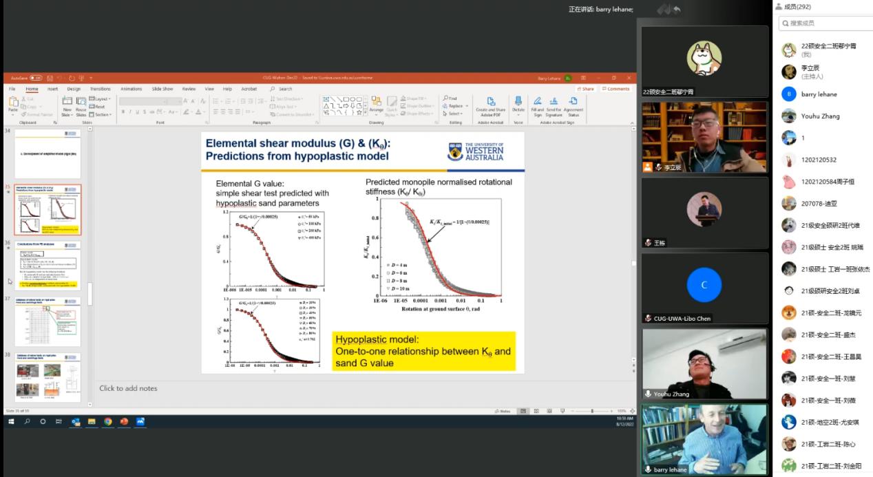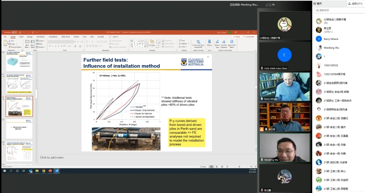 (通讯员 李立辰 黄静)12月8日上午,应太阳成tyc33455ccwww吴文兵教授与李立辰博士的邀请,西澳大学Barry Lehane教授做客工程文化论坛,为公司师生进行线上学术报告。此活动为太阳成tyc33455ccwww(武汉)70周年校庆系列学术活动之一。太阳成tyc33455ccwww勘察与基础工程系博士后李立辰主持报告,300余名师生与行业专家参加了本次活动。