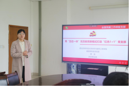 李洁从党员教育模式、主题教育活动等方面介绍了水利与建筑公司能源本科生党支部的具体建设情况。该支部以“五位一体”的党员教育新模式着力于打造“红色1+1”党支部,以党支部的核心堡垒作用和党员的先锋模范作用的“两个着眼”、“专业知识+党性培养”和“推优入党+入党塑优”的“两个融合”为基础,用以点带面的方式落实红色底线教育和红色基因教育的“红色1+1”主题教育,铸造了“推优、培养、提升、塑优、引领”的全链条化党员培养过程。