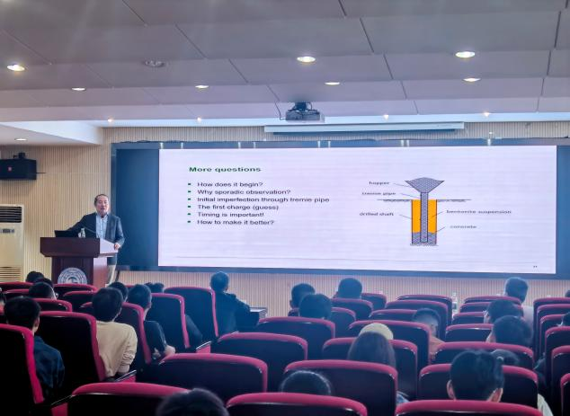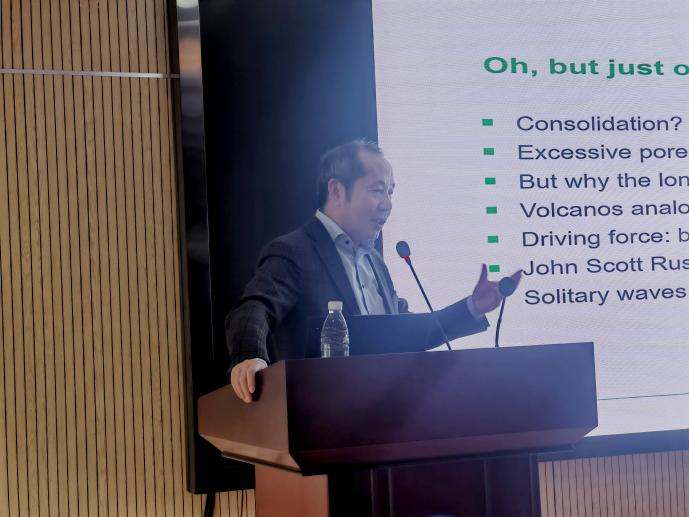 吴伟教授作了题为“Bleeding of fresh concret in deep foundations”的学术讲座。以深基础桩混凝土灌筑为研究背景,阐述了泥浆、钢筋混凝土在生产建设中发挥的重要作用。随后提及混凝土沥水现象,通过图片及视频资料展现了混凝土良好的流动性以及“Bleeding”现象发生的位置,详细介绍了混凝土沥水现象及地下混凝土建筑和桩的破坏现象,介绍了其团队在施工现场测出的混凝土渗水情况,讲述了一立方米混凝土沥水少于20升作为评判混凝土优劣的指标,并对桩基础中混凝土孤立波传播模拟过程进行展示。最后,吴伟教授以反向雨伞为引,介绍了混凝土在水体下降过程中以反向雨伞模型代替球体促使混凝土均匀下降的创新,并且提出了混凝土沥水过程中尚未研究充分的问题,亟待进一步研究。