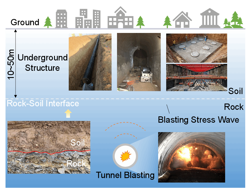 岩-土界面是最常见的地质界面,由于土体与岩体物理力学性质差别较大,地下爆破引起的应力波穿过岩-土界面时会发生剧烈的偏振,使得岩体与土体中爆破应力波衰减规律产生较大差异。岩-土界面两侧差异动力特性会对地下爆破工程施工产生影响,同时对既有地下结构的稳定性构成威胁。然而,岩-土界面对爆破应力波的影响特征尚不明确,严重制约地下工程与结构安全。