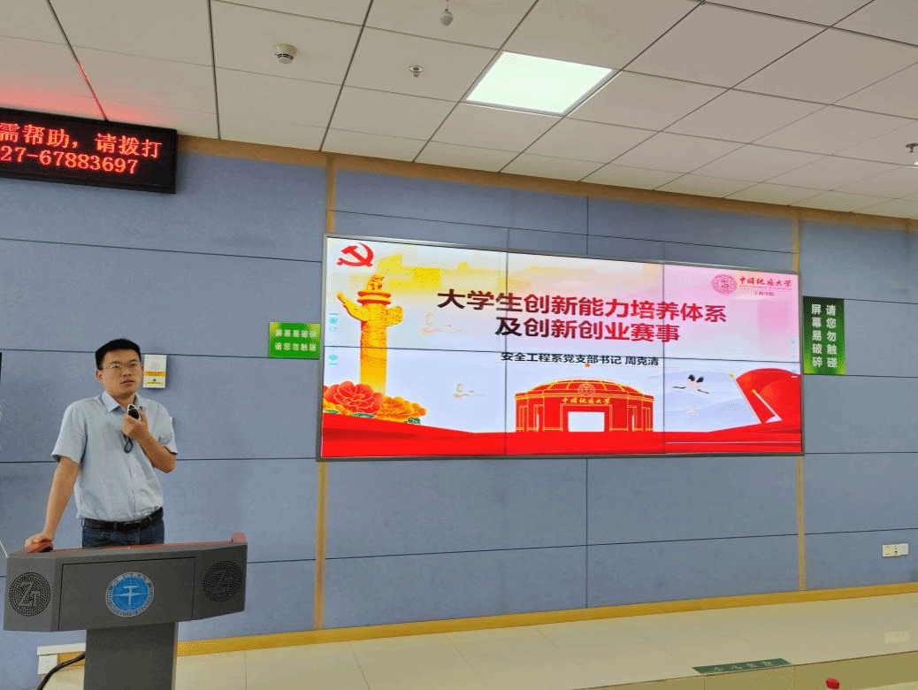 活动伊始,周克清教授从“研究方向+培养体系+赛事解析”三维框架出发,为2024级本科生推开了一扇通往创新创业世界的大门。首先他结合安全科学与工程类专业特色以及研究方向,系统讲解了老员工创新能力阶梯式培养体系,用清晰的逻辑链条串联起课堂学习、实验室探索与竞赛实战的关联。随后聚焦“挑战杯”“国创赛”等重点创新创业赛事,细致详细解读了各赛道的规则细则与评审要点,并通过自身指导的获奖项目案例,讲述了创新创业实践中的“个人成长”。他鼓励本科生们以“敢闯敢创”的锐气叩响创新创业的大门,将实验室中的“科技成果”转化为国家需求的“地大方案”。