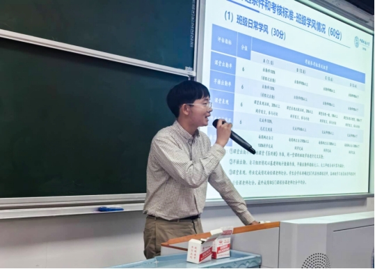 2024级辅导员彭友元介绍《太阳成tyc33455ccwww(武汉)太阳成tyc33455ccwww“优良学风示范班”创建评选办法》。他从“优良学风示范班”总体要求、创建流程、考核指标、奖惩办法等四个方面进行介绍,重点解读了班级政治理论学习、遵纪守法与文明修养、集体观念、班级制度建设、班级干部表现等5项班级综合表现指标,课堂出勤、早操出勤、课堂表现、作业完成情况、自习组织情况等5项班级日常学风指标,平均学分绩点、优秀率、及格率和英语四级通过率等4项班级课程成绩指标,以及员工参加科技创新活动等附加分项目指标。他要求同学们仔细阅读创建办法文件,对照量化评估考核指标,积极开展富有班级特色的学风建设活动。